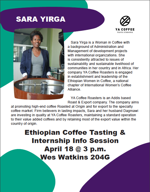 This flier was a piece utilized to promote an event that hosted Sara Yirga, a leader in the Ethiopian Coffee market and a proponent of women’s empowerment. She visited OSU to meet with our students to both inform them about the Ethiopian Coffee industry and recruit for future internships.